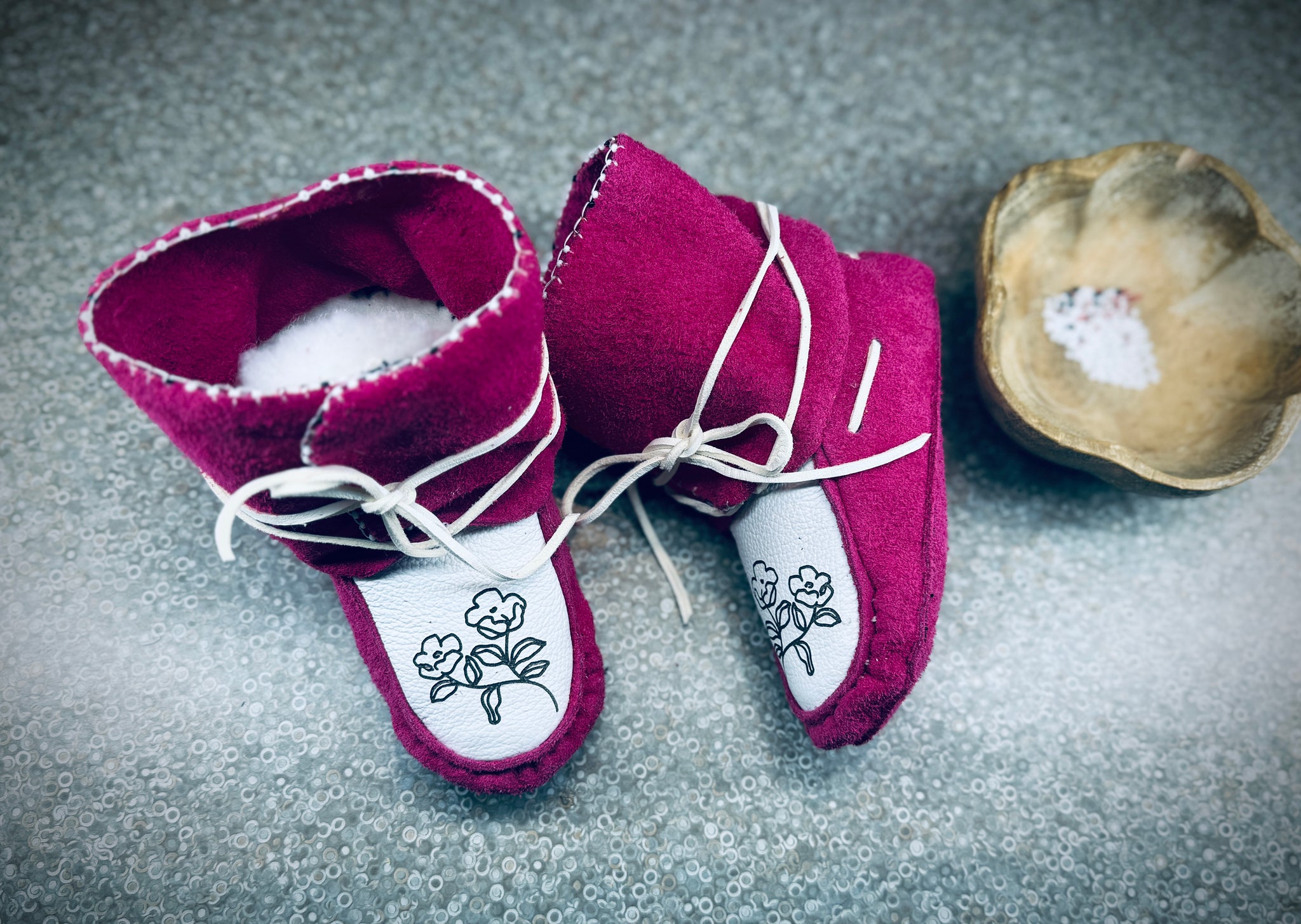 This pair is a toddler size 6 wraparound moccasin. winter lined with beaded edging around the tops.