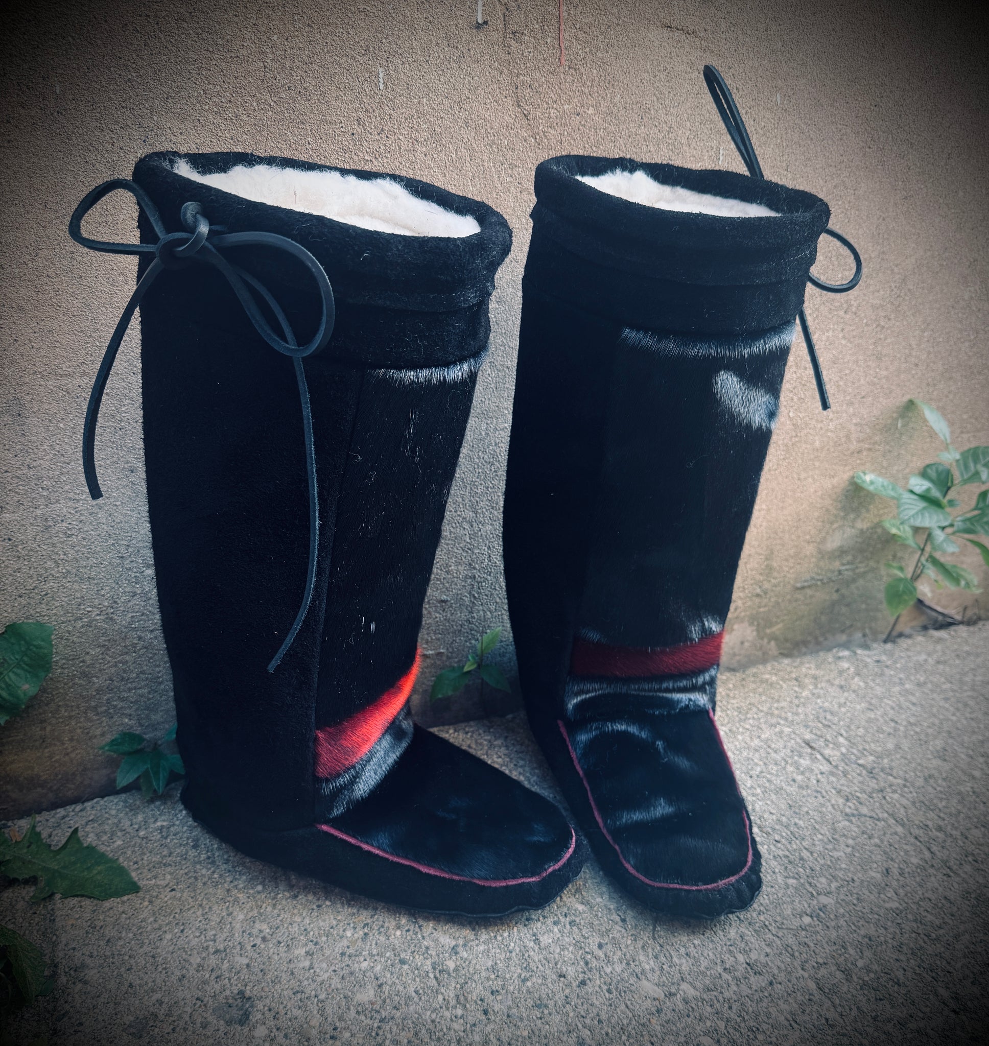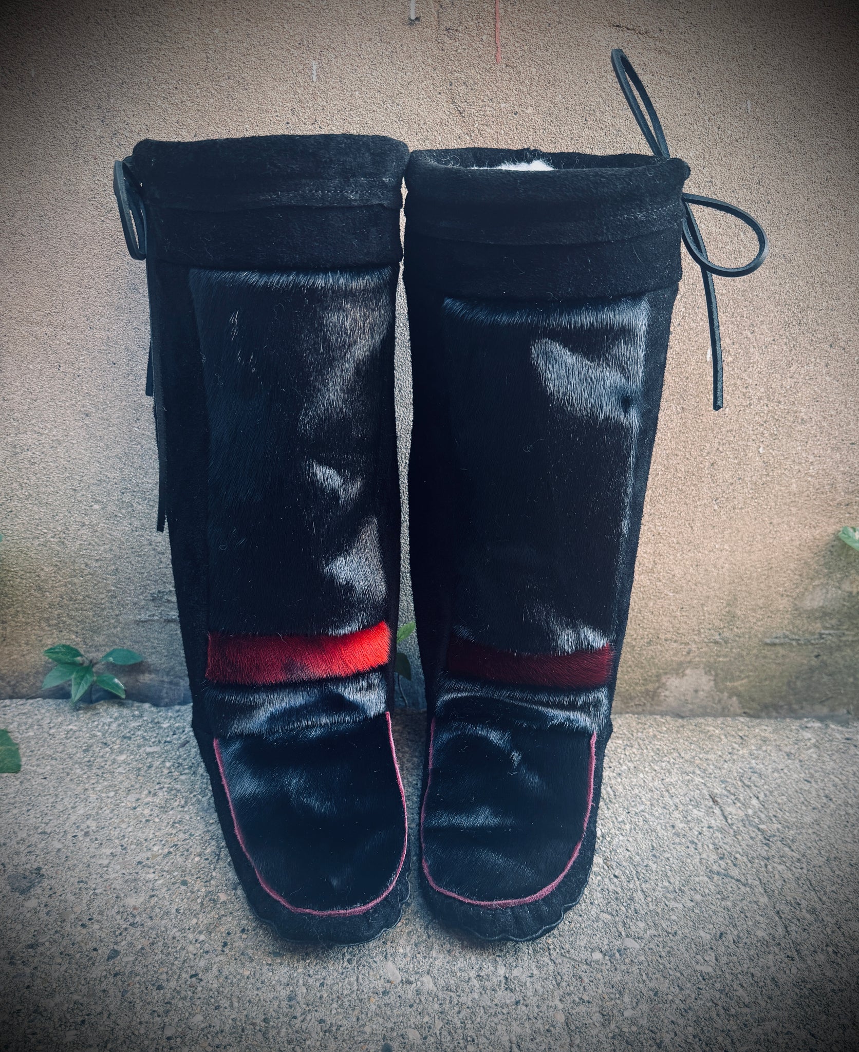 These Beautiful Mukluks are made with black suede. We have one pair of ladies size 9 which fit true to size, will be a snug fit to begin. Made with black and red seal and have rubber soles for outdoors.