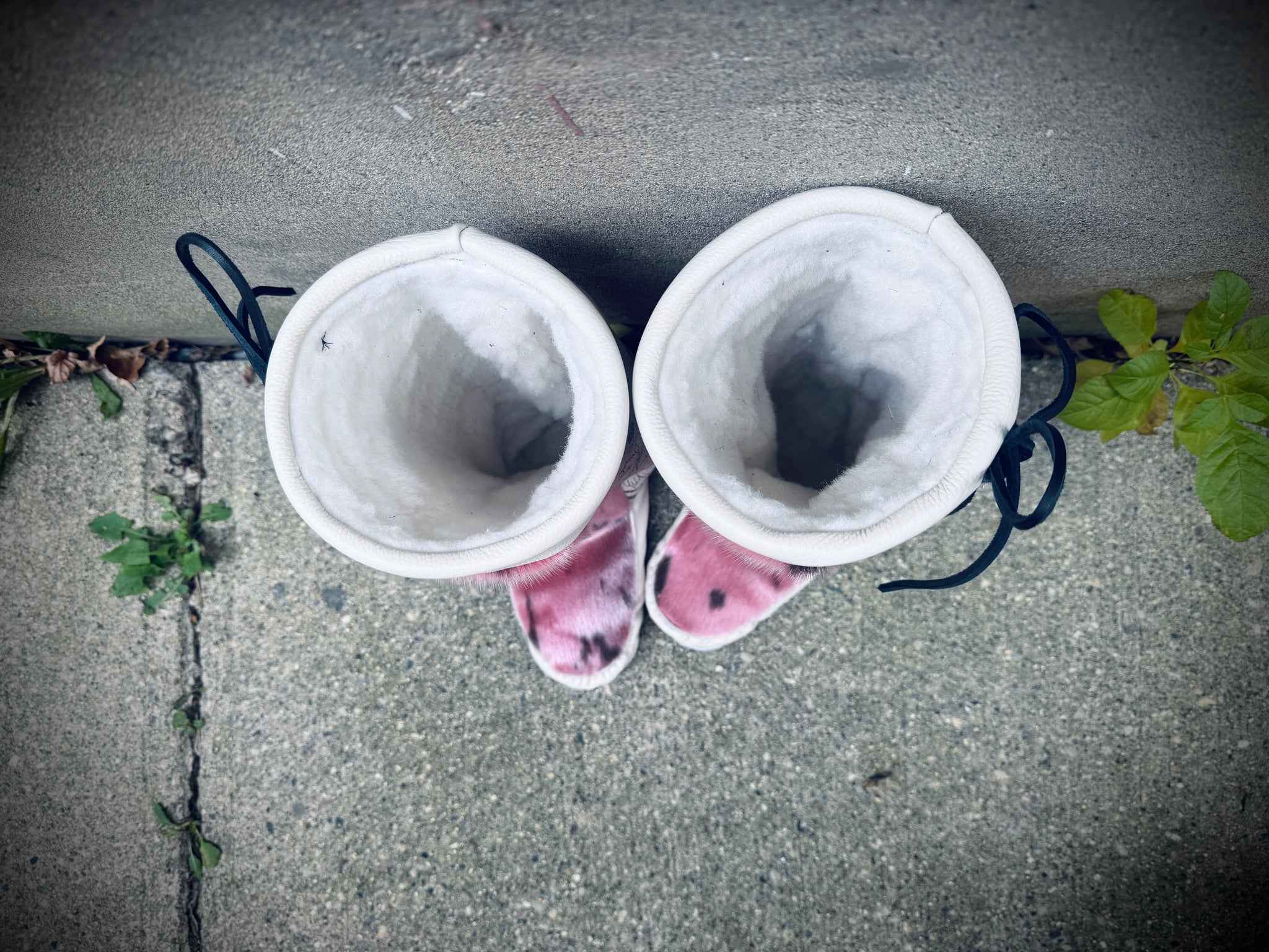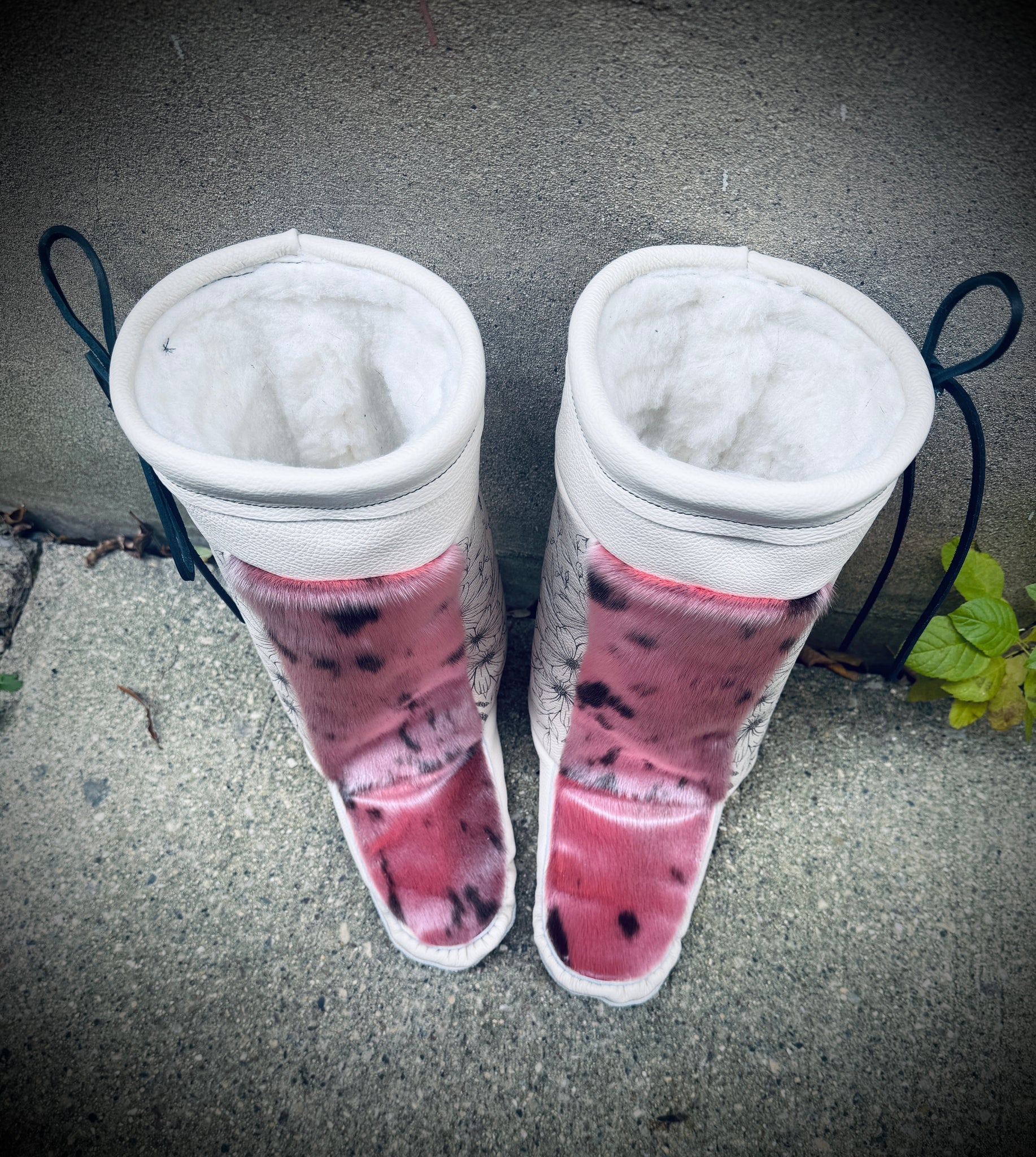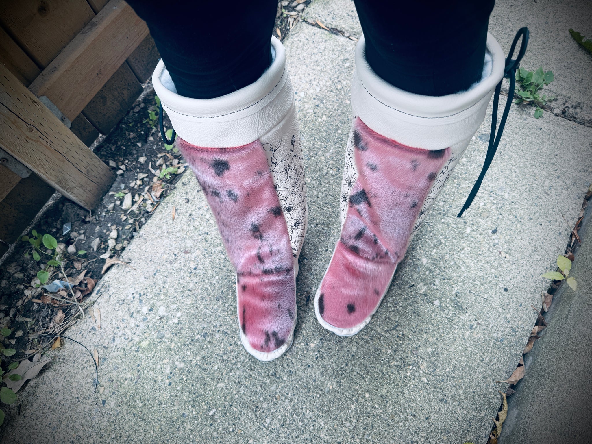 These Beautiful Mukluks are made with cream garment leather with a beautiful engraved floral design. We have one pair of ladies size 9 which fit true to size, will be a snug fit to begin. Made with pink dyed seal and have rubber soles for outdoors.