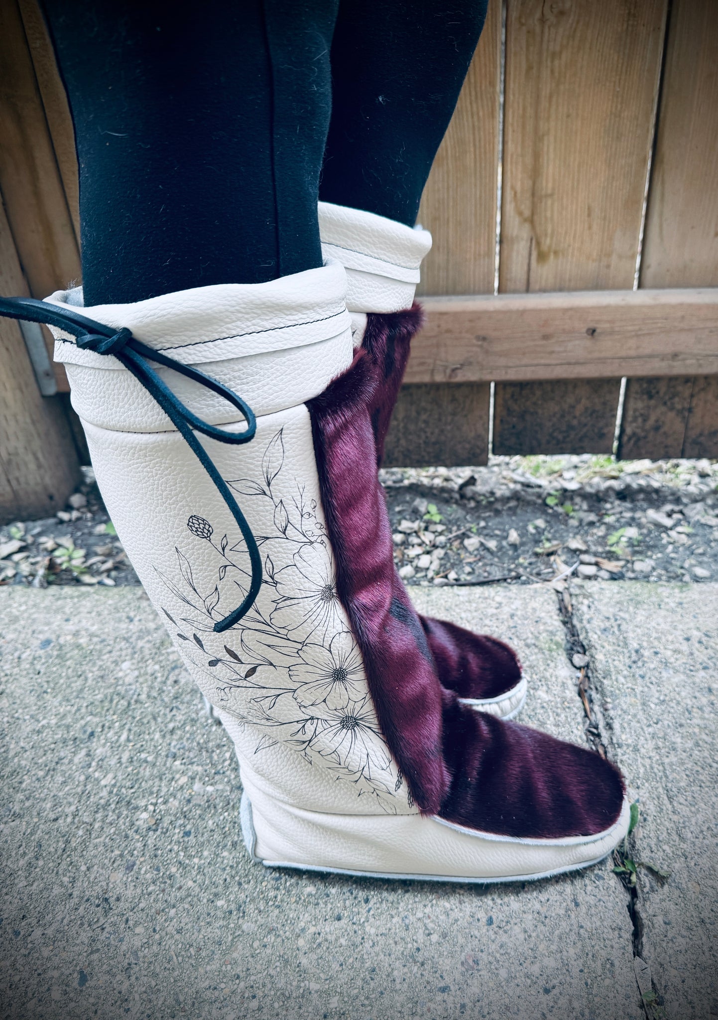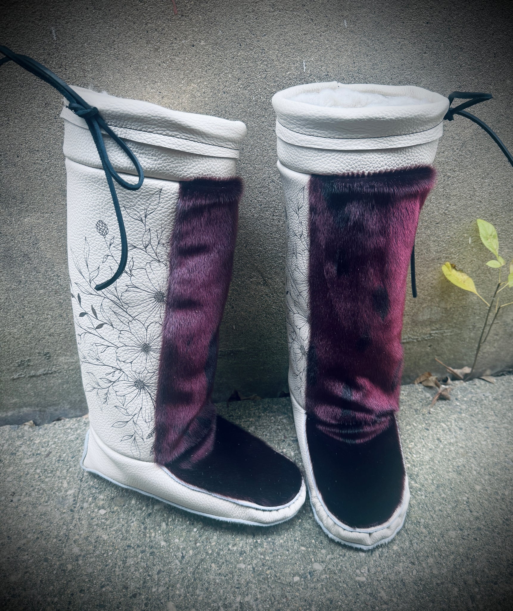 These Beautiful Mukluks are made with cream garment leather with a beautiful engraved floral design. We have one pair of ladies size 7 which fit true to size, will be a snug fit to begin. Made with wine/burgundy dyed seal and have rubber soles for outdoors.