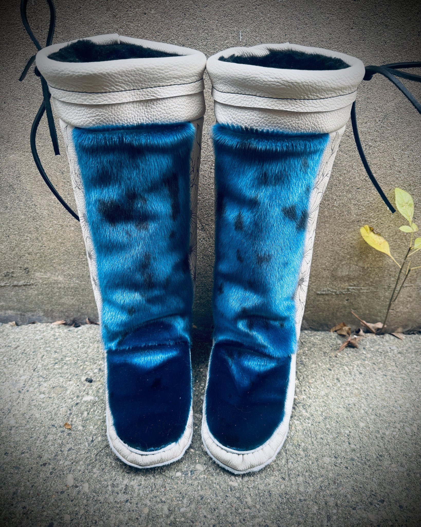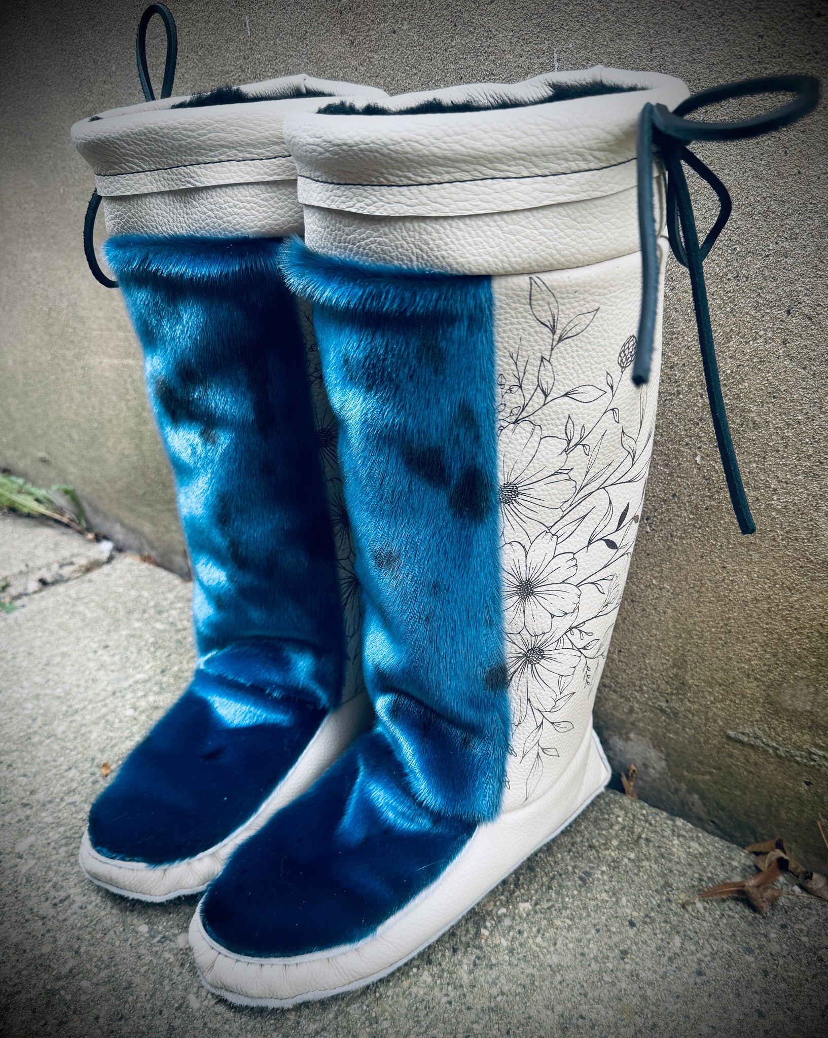 These Beautiful Mukluks are made with cream garment leather with a beautiful engraved floral design. We have one pair of ladies size 8 which fit true to size, will be a snug fit to begin. Made with blue dyed seal and have rubber soles for outdoors.